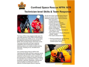 The focus of this 4 day program builds upon the core skills learned in the OH&S Confined Space Rescue Basics plus SCBA course, and provides the additional individual skill requirements of NFPA 1670 (Confined Space Technician Level). Technician-level skills and team response capabilities will be enhanced by hands-on teaching stations and realistic problem-solving exercises, including on-air, simulated IDLH scenarios.